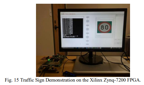 集成到FPGA中的应用处理器(AP)是用于控制加速器并启动计算。通过在FPGA内部使用DMA控制器,实现了加速器可以成功访问存储在DRAM中的数据和权重。演示设置如图15所示。演示从将交通标志下载到FPGA开始。计算完成后,检测到的交通标志结果将发送回PC并显示在监视器上。原始视频演示如所示。