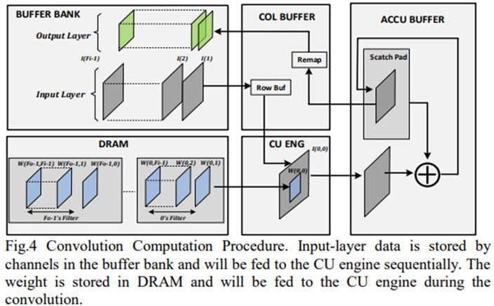 卷积从重置ACCU缓冲区中的图像scratchpad行开始。然后,输入层数据将按顺序发送到CU引擎。CU引擎将计算每个通道数据的内积及相应输出特征的滤波器权重。CU引擎的输出结果将被传递到ACCU缓冲块,并与暂存器中存储的结果一起累积。扫描完所有通道后,scratchpad行中累积的图像将作为输出特征之一发送回缓冲bank。