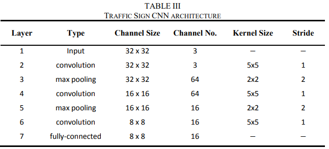 为了验证加速器的性能,有将硬件加速器IP下载到Xilinx Zynq 7200 FPGA中,使用修改了LeNet-5[21]来检测交通标志。过滤器坏了权重通过FPGA的现有的DMA控制器。DMA控制器配置为256深度64位宽度。交通标志网包括三个卷积层和两个池层,其结构总结见表三。