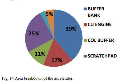 面积估计包括逻辑单元、寄存器和ARM编译器生成的单端口/双端口SRAM。如图所示,CU引擎仅占总面积的17%。缓冲区和scratchpad行占据了大部分区域。scratchpad采用双端口SRAM设计,以支持连续流,缓冲区组采用单端口SRAM实现。尽管scratchpad行内存的大小仅为缓冲区的1/6,但仍然占据了缓冲区一半以上的面积。
