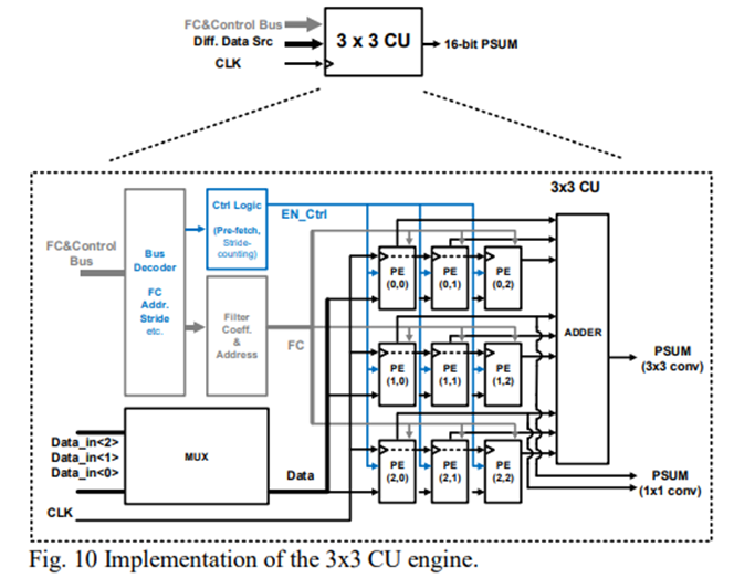 CU引擎阵列包括九个处理引擎(PE)和一个用于组合输出的加法器。PE为输入数据和滤波器权重提供乘法函数,同时通过D触发器将其输入数据传递给下一级的PE。当卷积步长大于1时,可以根据EN_Ctrl信号打开/关闭乘法函数,以节省计算能力。