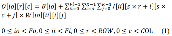 在这里𝑖𝑜 表示当前输出功能的索引号,Fi和𝐹𝑜 表示输入通道和输出功能的总数。r和c代表当前输出特征数据的行和列编号;s是卷积窗口的步长,𝑊 表示过滤器的权重,𝐵 表示每个过滤器的偏移权重。K𝑅𝑂𝑊 和𝐶𝑂𝐿, 分别是内核大小、输出特征行大小和列大小。