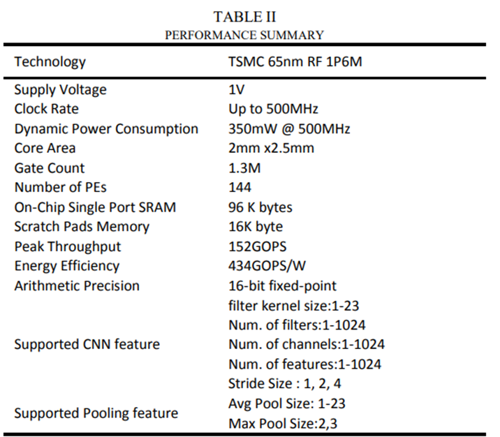 加速器在台积电65nm上实现加速器的技术和布局特征,如图13所示。核心尺寸为2mm x 2.5mm,在500MHz核心时钟下达到152 GOP/s的峰值吞吐量。由于内核可以支持任意大小的卷积层和池函数,可以加快大型CNN的建设。表II列出了芯片规格的摘要。电源基于概要设计汇编中的综合报告,面积和时钟速度基于Cadence中的地址和路线报告。PE代表芯片中的处理引擎,每个CU中的乘法器。能量效率定义为峰值吞吐量除以动态功耗。