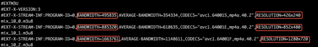 以 HLS 为例,使用 master playlist 索引一个视频不同分辨率的版本。如上图所示,视频一共包含了3种不同的版本,分辨率分别是 426×240,852×480 和 1280×720。BANDWIDTH 表示了该版本对应的码率,分辨率越高的的版本,码率也越大。