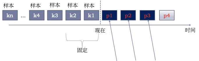 基于带宽预测的算法,可以获得一个预测的视频码率,播放器选择一个不高于预测带宽的视频进行播放。预测的方法是:以当前时间之前的固定时间段的样本(k1,k2)作为参考,计算调和平均值(倒数的平均的倒数),作为预测的视频码率(p1)。该算法仅基于历史的样本预测带宽,准确性不佳。