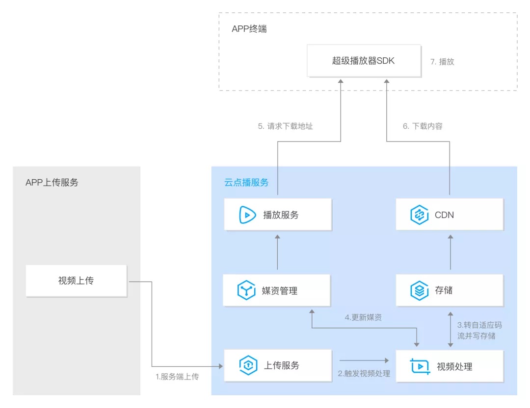 1. 服务端上传:业务后台通过控制台、服务端 API 等方式,将视频上传到云点播。