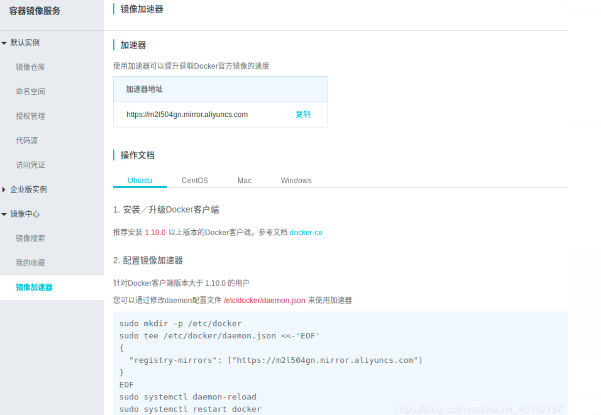 由于docker的官方的镜像源速度太慢,在国内可以通过使用阿里云或者网易云的镜像源提高下载速度,通常使用阿里云的镜像源,下面介绍怎么使用阿里云的镜像加速器。