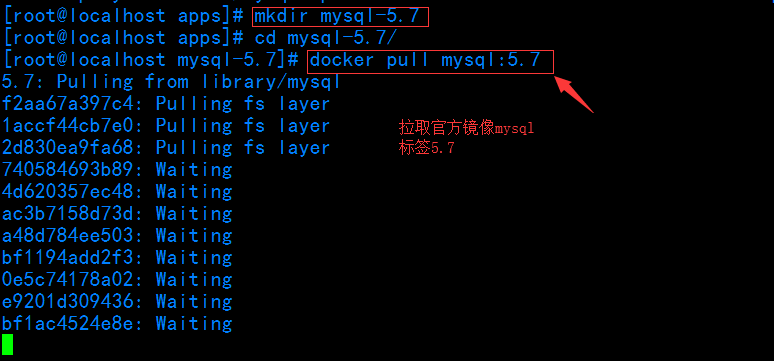 2.拉取官方镜像 标签为5.7,在此之前,先创建一个mysql目录,在目录中拉取