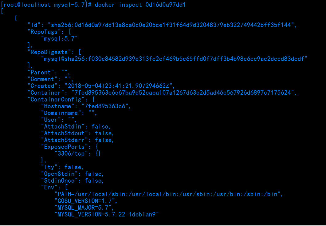 [root@localhost mysql-5.7]# docker inspect 84a239a98f17 [ { "Id": "84a239a98f1775d6644c7dbe49f8bd5b007283988431911ff7c7175f0c39c5c8", "Created": "2018-06-19T08:45:12.811272153Z", "Path": "docker-entrypoint.sh", "Args": [ "mysqld" ], "State": { "Status": "running", "Running": true, "Paused": false, "Restarting": false, "OOMKilled": false, "Dead": false, "Pid": 27162, "ExitCode": 0, "Error": "", "StartedAt": "2018-06-19T08:45:13.123434469Z", "FinishedAt": "0001-01-01T00:00:00Z" }, "Image": "sha256:0d16d0a97dd13a8ca0c0e205ce1f31f64d9d32048379eb322749442bff35f144", "ResolvConfPath": "/var/lib/docker/containers/84a239a98f1775d6644c7dbe49f8bd5b007283988431911ff7c7175f0c39c5c8/resolv.conf", "HostnamePath": "/var/lib/docker/containers/84a239a98f1775d6644c7dbe49f8bd5b007283988431911ff7c7175f0c39c5c8/hostname", "HostsPath": "/var/lib/docker/containers/84a239a98f1775d6644c7dbe49f8bd5b007283988431911ff7c7175f0c39c5c8/hosts", "LogPath": "/var/lib/docker/containers/84a239a98f1775d6644c7dbe49f8bd5b007283988431911ff7c7175f0c39c5c8/84a239a98f1775d6644c7dbe49f8bd5b007283988431911ff7c7175f0c39c5c8-json.log", "Name": "/mysql4SXD", "RestartCount": 0, "Driver": "overlay2", "Platform": "linux", "MountLabel": "", "ProcessLabel": "", "AppArmorProfile": "", "ExecIDs": null, "HostConfig": { "Binds": [ "/apps/mysql-5.7/conf:/etc/mysql/conf.d", "/apps/mysql-5.7/logs:/logs", "/apps/mysql-5.7/data:/var/lib/mysql" ], "ContainerIDFile": "", "LogConfig": { "Type": "json-file", "Config": {} }, "NetworkMode": "default", "PortBindings": { "3306/tcp": [ { "HostIp": "", "HostPort": "33060" } ] }, "RestartPolicy": { "Name": "no", "MaximumRetryCount": 0 }, "AutoRemove": false, "VolumeDriver": "", "VolumesFrom": null, "CapAdd": null, "CapDrop": null, "Dns": [], "DnsOptions": [], "DnsSearch": [], "ExtraHosts": null, "GroupAdd": null, "IpcMode": "shareable", "Cgroup": "", "Links": null, "OomScoreAdj": 0, "PidMode": "", "Privileged": false, "PublishAllPorts": false, "ReadonlyRootfs": false, "SecurityOpt": null, "UTSMode": "", "UsernsMode": "", "ShmSize": 67108864, "Runtime": "runc", "ConsoleSize": [ 0, 0 ], "Isolation": "", "CpuShares": 0, "Memory": 0, "NanoCpus": 0, "CgroupParent": "", "BlkioWeight": 0, "BlkioWeightDevice": [], "BlkioDeviceReadBps": null, "BlkioDeviceWriteBps": null, "BlkioDeviceReadIOps": null, "BlkioDeviceWriteIOps": null, "CpuPeriod": 0, "CpuQuota": 0, "CpuRealtimePeriod": 0, "CpuRealtimeRuntime": 0, "CpusetCpus": "", "CpusetMems": "", "Devices": [], "DeviceCgroupRules": null, "DiskQuota": 0, "KernelMemory": 0, "MemoryReservation": 0, "MemorySwap": 0, "MemorySwappiness": null, "OomKillDisable": false, "PidsLimit": 0, "Ulimits": null, "CpuCount": 0, "CpuPercent": 0, "IOMaximumIOps": 0, "IOMaximumBandwidth": 0 }, "GraphDriver": { "Data": { "LowerDir": "/var/lib/docker/overlay2/30be23c185b7a236a2b22e66a5085537efc52232579a81147fd35e9a1a985a50-init/diff:/var/lib/docker/overlay2/69517a5927a811ce35906111fa25b5624edcc4e1a8ef8f0f142b4fc535685a88/diff:/var/lib/docker/overlay2/3ed3c6fb930bac0cb31b1b8fcc92b66e5557bad06ba0224dcb191c1c86e31d39/diff:/var/lib/docker/overlay2/828e767204392dd67f25ca076c77859c34559d638ef412cbc09579c56472444a/diff:/var/lib/docker/overlay2/20760b885e8c95781a63d5ad3c6a014275302b35726025c2377d3467a699abb0/diff:/var/lib/docker/overlay2/82665ac0867c090a438841853e35abf3eaafdd6d0aa23ad90c420da0e6867bbc/diff:/var/lib/docker/overlay2/5c48f19545216452ac99c428dfd913c80a1dd11388fa6777069d2706dc48a937/diff:/var/lib/docker/overlay2/94df4ac88cde8f504a4eb2d6a53c6a9a73c436dcaeeaf4fc9eb39a6f252263bc/diff:/var/lib/docker/overlay2/0bde00b0bfbf21da1d1d8999dad6d0e5029cd65ff1e02238cd097087a096573d/diff:/var/lib/docker/overlay2/4715e424689cc30667c39d411747c9a64ded56f450d1df733c454ddfc1230e0b/diff:/var/lib/docker/overlay2/77deb18f119a33c30795f60a15454f209ca2059bd329532f67eb8d07a97a5e51/diff:/var/lib/docker/overlay2/57e3c1d7be6569d6a1f52db172c973888855c1f4eac49c02fb07fc74639a2e0d/diff", "MergedDir": "/var/lib/docker/overlay2/30be23c185b7a236a2b22e66a5085537efc52232579a81147fd35e9a1a985a50/merged", "UpperDir": "/var/lib/docker/overlay2/30be23c185b7a236a2b22e66a5085537efc52232579a81147fd35e9a1a985a50/diff", "WorkDir": "/var/lib/docker/overlay2/30be23c185b7a236a2b22e66a5085537efc52232579a81147fd35e9a1a985a50/work" }, "Name": "overlay2" }, "Mounts": [ { "Type": "bind", "Source": "/apps/mysql-5.7/conf", "Destination": "/etc/mysql/conf.d", "Mode": "", "RW": true, "Propagation": "rprivate" }, { "Type": "bind", "Source": "/apps/mysql-5.7/logs", "Destination": "/logs", "Mode": "", "RW": true, "Propagation": "rprivate" }, { "Type": "bind", "Source": "/apps/mysql-5.7/data", "Destination": "/var/lib/mysql", "Mode": "", "RW": true, "Propagation": "rprivate" } ], "Config": { "Hostname": "84a239a98f17", "Domainname": "", "User": "", "AttachStdin": false, "AttachStdout": false, "AttachStderr": false, "ExposedPorts": { "3306/tcp": {} }, "Tty": false, "OpenStdin": false, "StdinOnce": false, "Env": [ "MYSQL_ROOT_PASSWORD=398023", "PATH=/usr/local/sbin:/usr/local/bin:/usr/sbin:/usr/bin:/sbin:/bin", "GOSU_VERSION=1.7", "MYSQL_MAJOR=5.7", "MYSQL_VERSION=5.7.22-1debian9" ], "Cmd": [ "mysqld" ], "ArgsEscaped": true, "Image": "mysql:5.7", "Volumes": { "/var/lib/mysql": {} }, "WorkingDir": "", "Entrypoint": [ "docker-entrypoint.sh" ], "OnBuild": null, "Labels": {} }, "NetworkSettings": { "Bridge": "", "SandboxID": "9ad51b14aa486f96b3883fc9acff476387b94b833457e91147a6c77ebb3126a5", "HairpinMode": false, "LinkLocalIPv6Address": "", "LinkLocalIPv6PrefixLen": 0, "Ports": { "3306/tcp": [ { "HostIp": "0.0.0.0", "HostPort": "33060" } ] }, "SandboxKey": "/var/run/docker/netns/9ad51b14aa48", "SecondaryIPAddresses": null, "SecondaryIPv6Addresses": null, "EndpointID": "65eee1d8d440722dc95e7eac27987bb2a627ea26ff00ecd3f042eec68b835724", "Gateway": "172.17.0.1", "GlobalIPv6Address": "", "GlobalIPv6PrefixLen": 0, "IPAddress": "172.17.0.2", "IPPrefixLen": 16, "IPv6Gateway": "", "MacAddress": "02:42:ac:11:00:02", "Networks": { "bridge": { "IPAMConfig": null, "Links