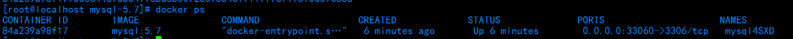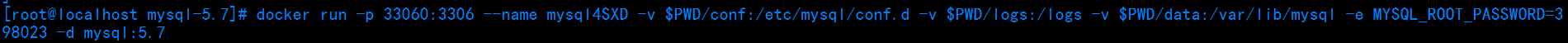 docker run -p 33060:3306 --name mysql4SXD -v $PWD/conf:/etc/mysql/conf.d -v $PWD/logs:/logs -v $PWD/data:/var/lib/mysql -e MYSQL_ROOT_PASSWORD=398023 -d mysql:5.7