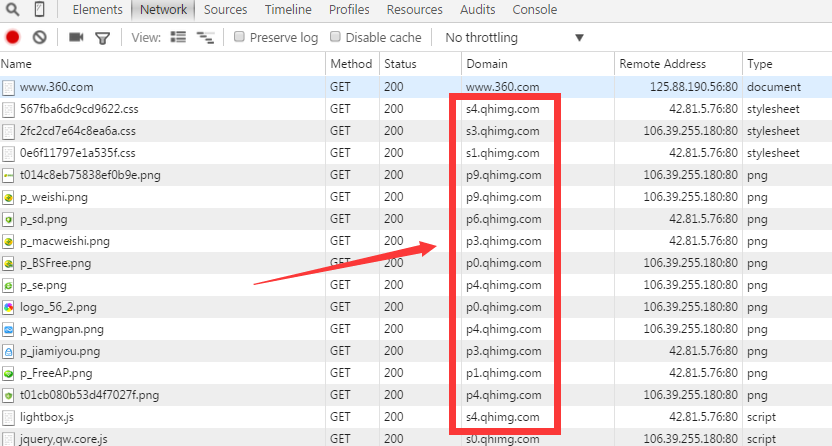 其实大型网站均是做了动静分离的,例如我们的奇虎360官网,就是单独用其他的专用域名来加载静态文件的~如下图: