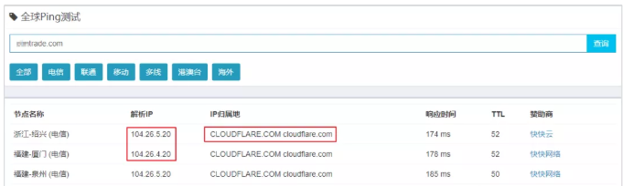 利用“全球Ping”快速检测目标网址是否存在CDN,如果得到的IP归属地是某CDN服务商,或者每个地区得到的IP地址都不一样则说明可能存在CDN,可用以下几个网站检测!