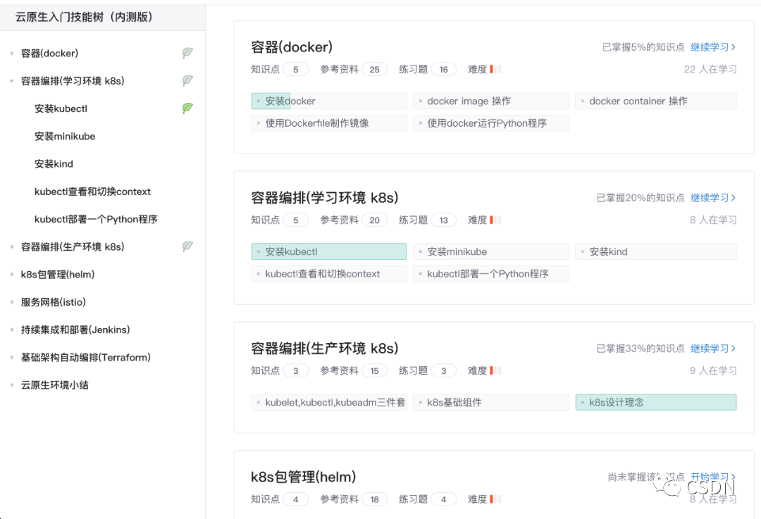 这些云原生环境是如何一步一步搭建出来的呢?对于很多初学者来说,有很多未知的新技术、工具、和流程,在 “云原生入门技能树”里,我做了一个经过反复调整的设计:云原生入门技能树