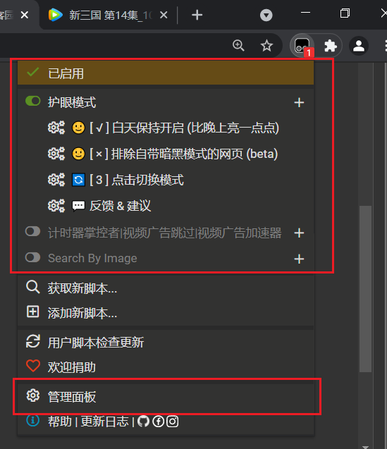 所有下载的脚本都在浏览器右上角可以看到并进行管理: