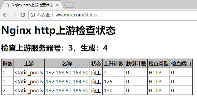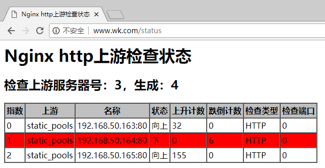 worker_processes 1; events { worker_connections 1024; } http { include mime.types; default_type application/octet-stream; sendfile on; keepalive_timeout 65; upstream static_pools { server 192.168.50.163:80 weight=1; server 192.168.50.164:80 weight=1; server 192.168.50.165:80 weight=1; check interval=3000 rise=2 fall=5 timeout=1000 type=http; #对static服务器池开启健康监测 } server { listen 80; server_name www.wk.com; location /status { check_status; #启动健康检查模块 access_log off; #关闭此location的访问日志记录 } } }