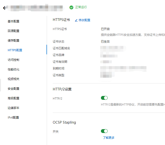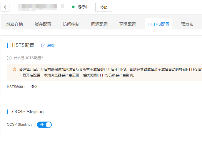进入HTTPS设置中,找到OCSP装订配置,启用即可。