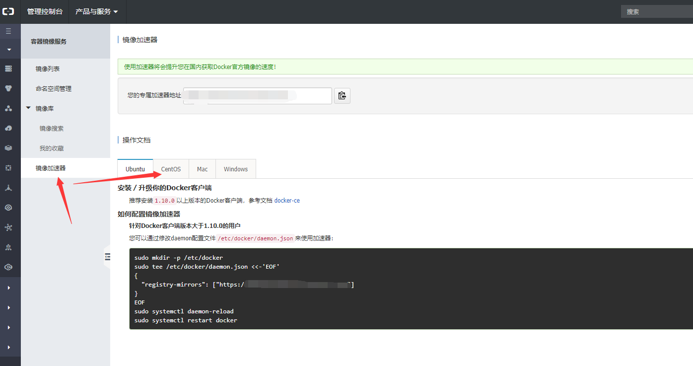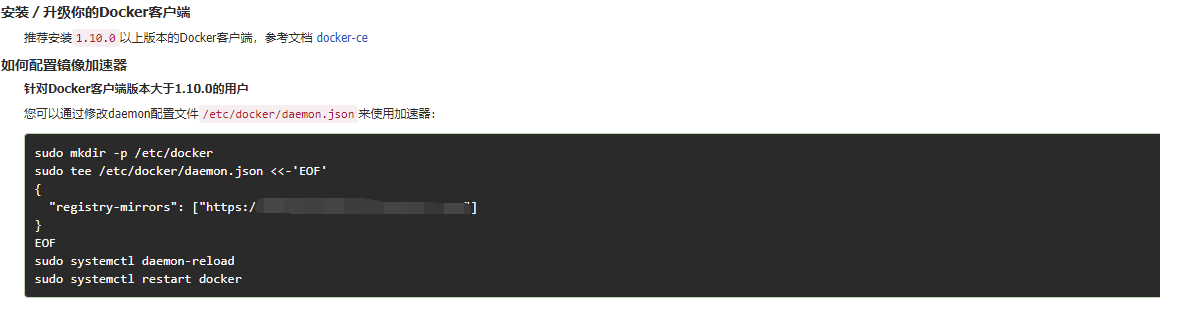 tee /etc/docker/daemon.json <<-'EOF' { "registry-mirrors": ["http://加速器地址"] # 注意一定要修改加速器地址,也就是上面的图片上打马赛克的地址 } EOF systemctl daemon-reload systemctl restart docker