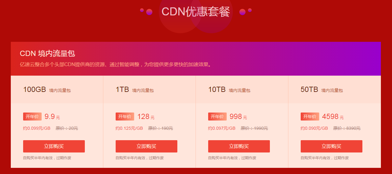庚子新春开年,亿速云推出的五大优惠套餐当中包含了“CDN优惠套餐”。新春开年活动期间,购买CDN优惠套餐的境内加速流量包,可享受到比平时更低、更划算的优惠价格。