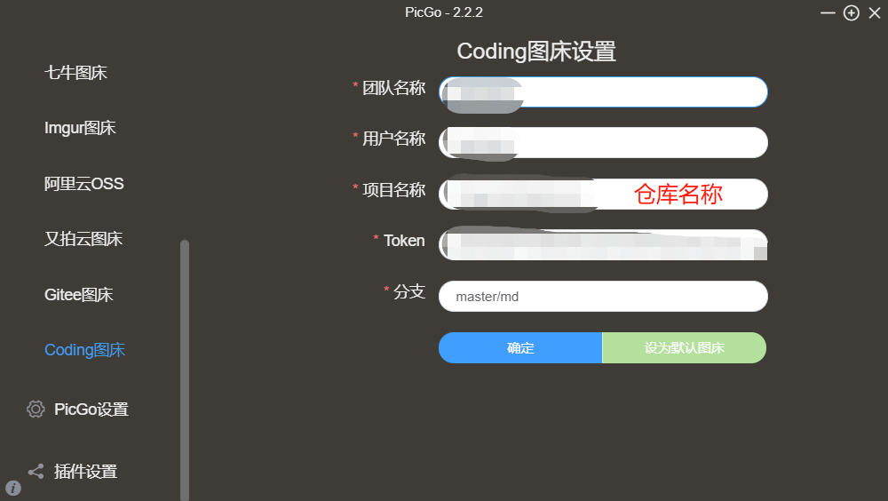 然后在picgo填上信息,分支那里如果是要把图片放在master分支根目录,就直接写master。例如我要放在master分支的md文件夹,那么我就填master/md