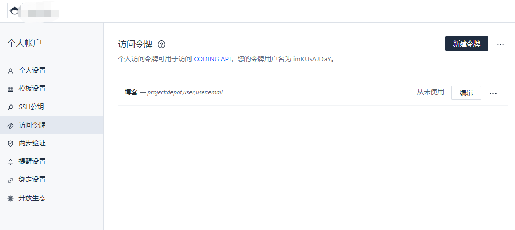 在用之前先取一下token(就是这个仓库用来识别使用非git的第三方应用有没有权限提交文件到该仓库的东西),在右上角的个人设置–访问令牌里新建