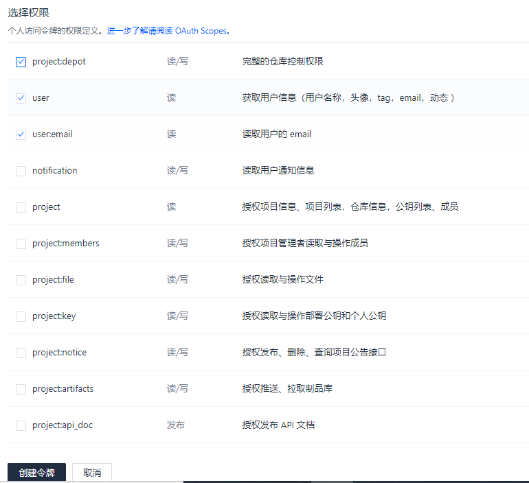 按需勾选,我就直接勾选前三个了,必须要保证token可以读写仓库,创建令牌之后会有一串字符,这个就是token,注意这个只显示一次(刷新或者退出页面就没了)保存一下这个token