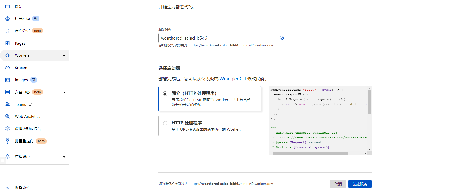 - 登陆cloudflare,点击左边侧栏的Workers,然后点击创建服务,然后默认配置即可