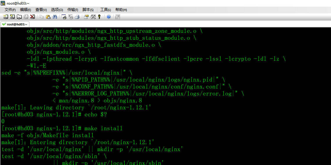 [root@hd3 ~]#./configure –prefix=/usr/local/nginx –add-module=/root/fastdfs-nginx-module-master/src –with-http_stub_status_module –with-http_ssl_module