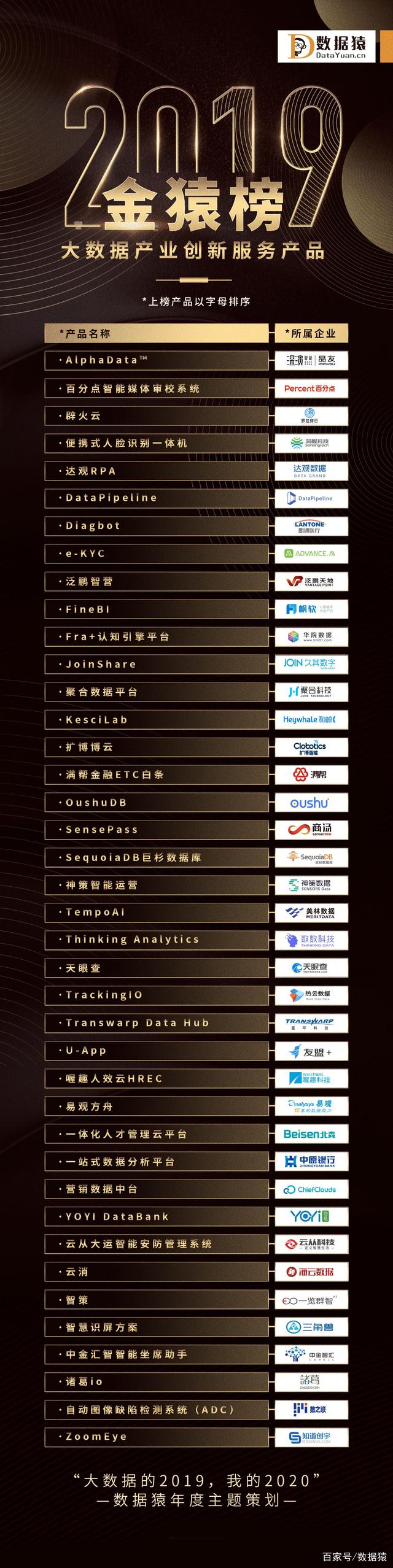 2019大数据产业创新服务产品TOP 40以下是荣登此次金猿榜,并获得金猿奖的优秀产品展示,排名不分先后,均按字母顺序排列,数字仅为编号易于识别使用,不作为排名参考。