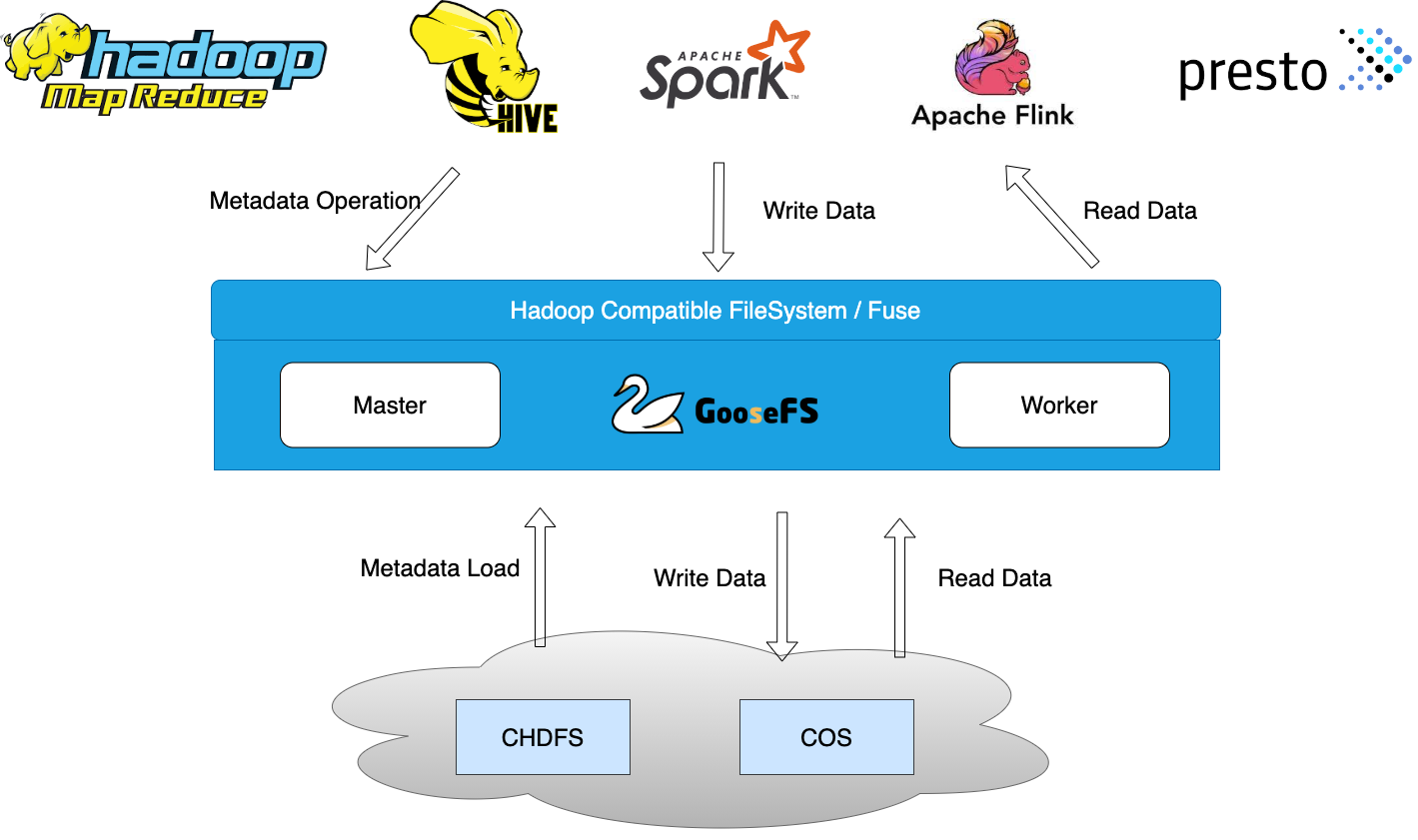 GooseFS 是腾讯云对象存储团队近期面向下一代云原生数据湖场景推出的存储加速利器,提供与 HDFS 对标的 Hadoop Compatible FileSystem 接口实现,可为云上的大数据计算任务提供: