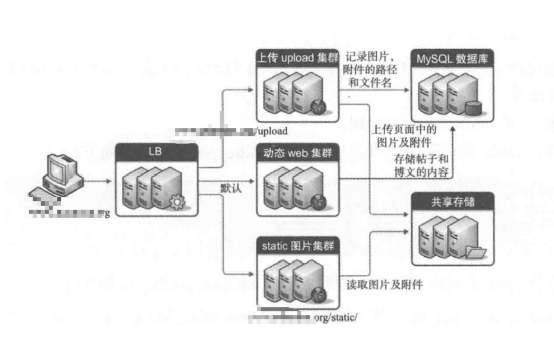 此架构图适合网站前端只使用同一个域名提供服务的场景,例如访问www.joker.com,然后当用用户请求www.joker.com/static地址的时候,代理会分配请求到静态服务器池请求数据;当用户请求www.joker.com/upload地址的时候,代理会分配请求到上传服务器池处理数据;当用户请求www.joker.com地址的时候,即不包含上述指定的目录地址路径时,代理会分配请求到默认的动态服务器池请求数据
