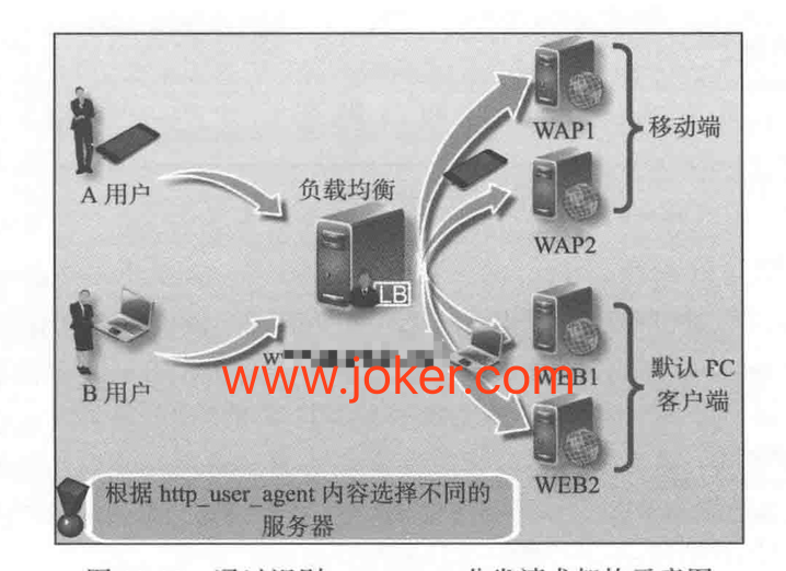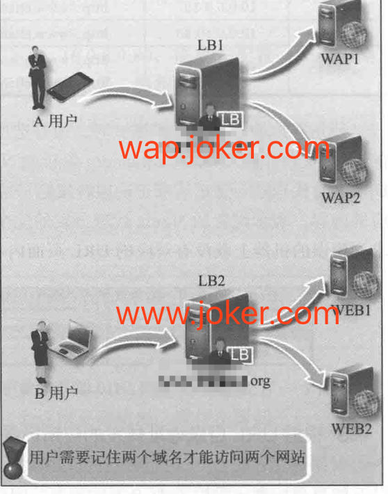 在常规4层负载架构下,可以使用不同的域名来实现这个需求,例如 移动端用户访问wap.joker.com,pc端用户访问www.joker.com,此解决方案最大的问题就是不同的客户端需要记住域名,而绝大多数用户只会记住www.joker.com,这样一来就会导致用户体验不是很好。