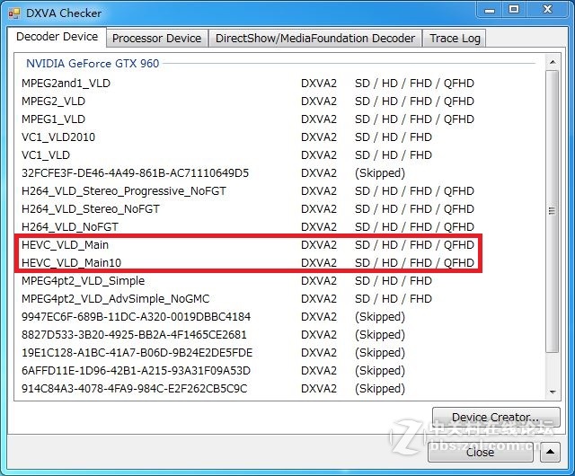 支持H.265解码的显卡,可以使DXVA Checker显卡加速检测工具来检测,通过查看里面有没有HEVC_VLD_Main这一项,以及有没有最大QFHD影片解析度
