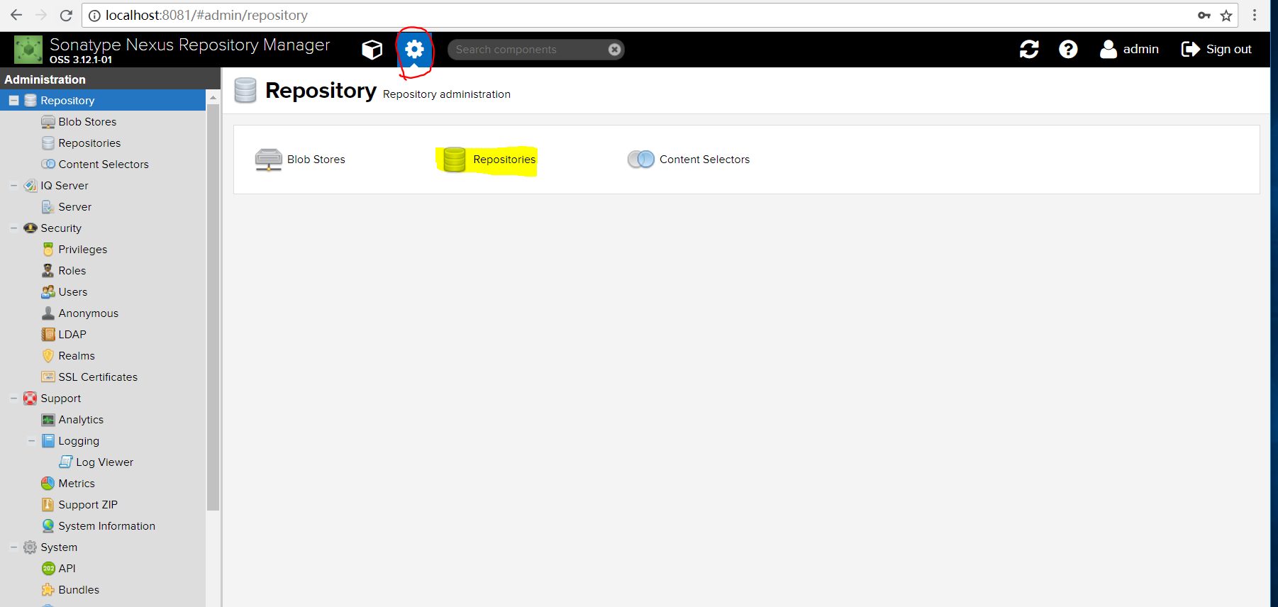 访问你的Nexus, 如 http://localhost:8081/, 点击Sign in, 默认登陆是 admin/admin123. 登陆成功后,点击下图中的齿轮图标, 点Repositories.