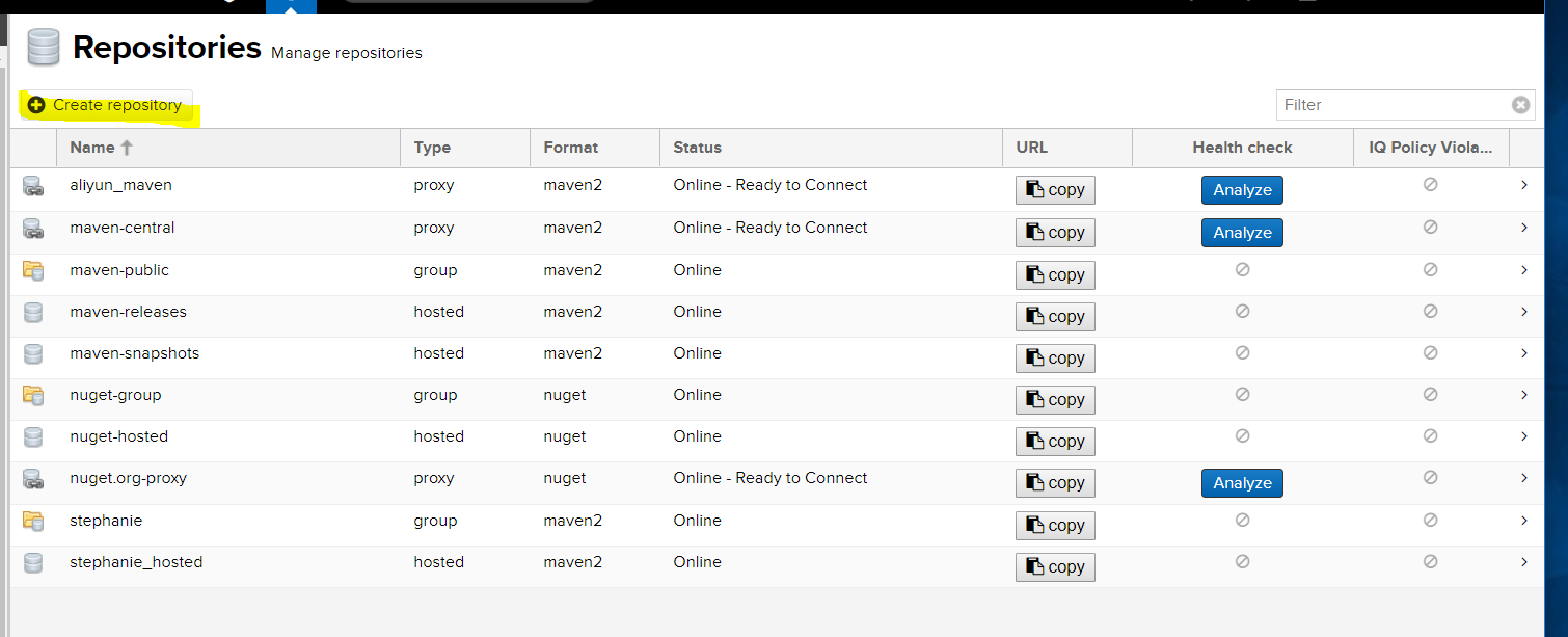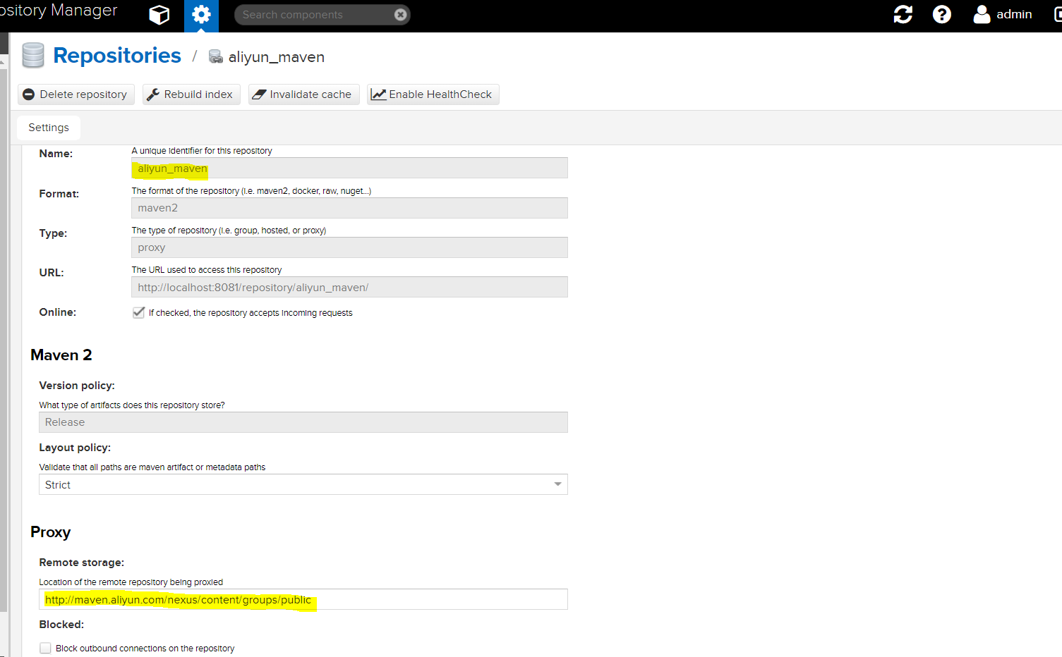 再点:Create Repositories =》 maven(proxy), 输入名字,如aliyun_maven, 关键在Proxy URL输入阿里云Nexus仓库的URL: http://maven.aliyun.com/nexus/content/groups/public ,保存。