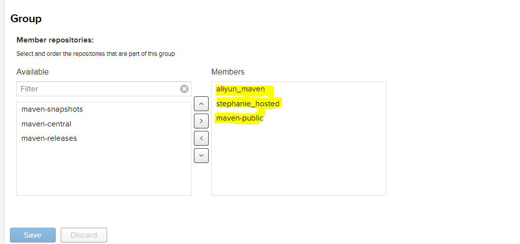 Create Repositories =》 在maven(group), 设置Nexus获取依赖的优先顺序。如下图,优先去阿里云的Maven库:http://maven.aliyun.com/nexus/content/groups/public下载jar, 最后是https://repo.maven.apache.org .