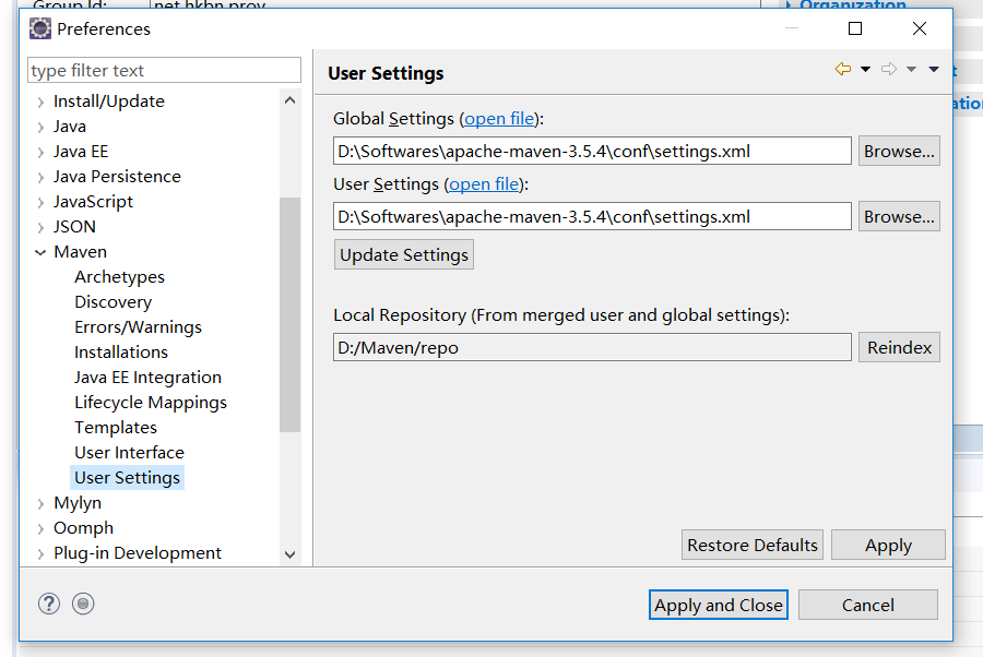设置Eclipse使用外部Maven. Windows => Preference => Maven => User Settings, 如下。