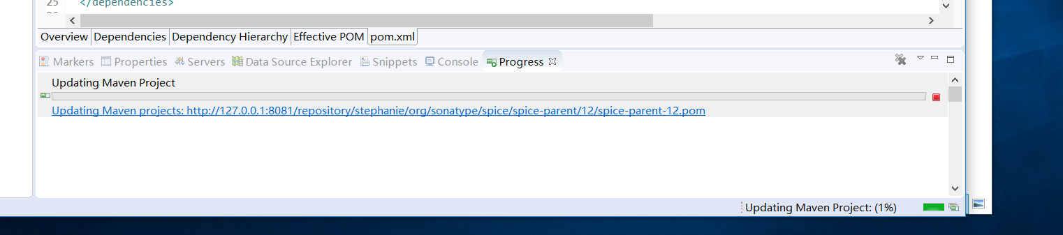 测试设计是否成功,可以在项目的pom.xml文件中导入新dependency或者更改现有dependency version, 保存. 在项目上点右键,Maven => Update. 在Eclipse右下角出现下载的进度条,点击查看。