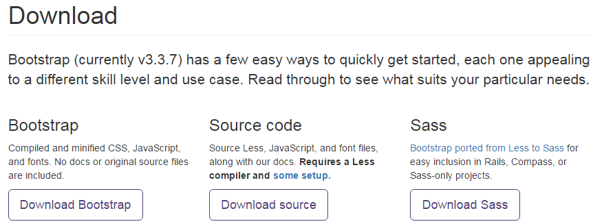 Download Bootstrap:下载 Bootstrap。点击该按钮,您可以下载 Bootstrap CSS、JavaScript 和字体的预编译的压缩版本。不包含文档和最初的源代码文件。
