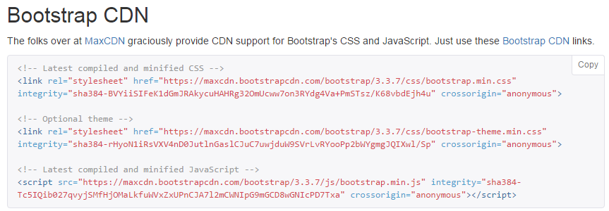 <!-- Latest compiled and minified CSS --> <link rel="stylesheet" href="https://maxcdn.bootstrapcdn.com/bootstrap/3.3.7/css/bootstrap.min.css" integrity="sha384-BVYiiSIFeK1dGmJRAkycuHAHRg32OmUcww7on3RYdg4Va+PmSTsz/K68vbdEjh4u" crossorigin="anonymous"> <!-- Optional theme --> <link rel="stylesheet" href="https://maxcdn.bootstrapcdn.com/bootstrap/3.3.7/css/bootstrap-theme.min.css" integrity="sha384-rHyoN1iRsVXV4nD0JutlnGaslCJuC7uwjduW9SVrLvRYooPp2bWYgmgJQIXwl/Sp" crossorigin="anonymous"> <!-- Latest compiled and minified JavaScript --> <script src="https://maxcdn.bootstrapcdn.com/bootstrap/3.3.7/js/bootstrap.min.js" integrity="sha384-Tc5IQib027qvyjSMfHjOMaLkfuWVxZxUPnCJA7l2mCWNIpG9mGCD8wGNIcPD7Txa" crossorigin="anonymous"></script>