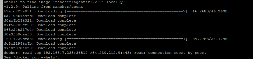 在学习rancher的时候去下载rancher/agent镜像的时候,出现报错:docker: read tcp 192.168.7.235:36512->54.230.212.9:443: read: connection reset by peer.