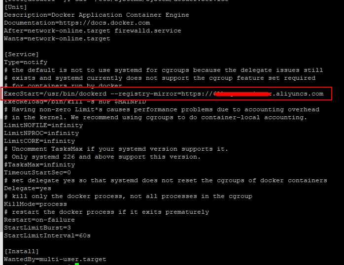 vim /etc/systemd/system/docker.service 进行修改自己的阿里云加速器的地址