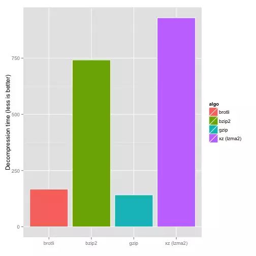 对于现在的互联网来说,最重要的性能可能是解压缩速度。即使在浏览器和移动设备等资源有限的情况下,客户端能够快速解压,有更良好的用户体验是现在所追求的。而在解压缩速度上,Brotli 依旧表现出色。