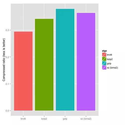 通过上图,我们可以看到 Brotli 与常用的压缩算法 bzip2、gzip、lzma2 对比,压缩比上有明显的优势。