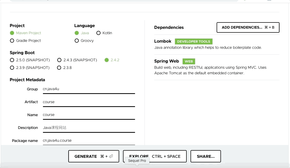 我改了下名字,叫 course,表明是教程网站的一个项目。同时我把默认的 Java 版本降到了 8,因为这个版本我比较常用。