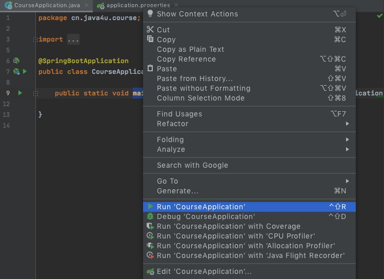 项目会为我们生成一个应用程序启动入口,选中 main 方法运行,这个 Spring Boot 程序就跑起来啦。