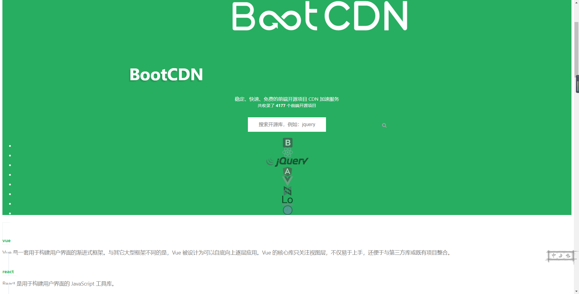 我们公司线上也有几个流量不大的页面也在用,自然也受到了影响。当时纯粹是懒了,顺手直接复制了,没有本地搭建。谁曾想到,再稳定的系统,也有崩的时候。就连bootcdn首页都在使用他家的cdn,如今变成这个样子: