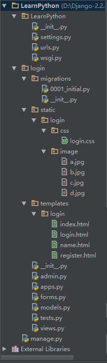 继续在/login/static/login目录下创建一个css和一个image目录,css中添加我们为登录视图写的css文件,这里是login.css,image目录中,拷贝进来你想要的背景图片,这里是bg.jpg。最终目录结构如下: