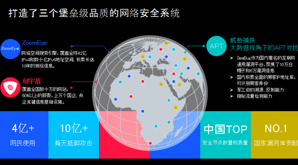 截止目前,知道创宇各产品共汇集4亿+网民使用,每天可抵御10亿+次攻击。同时,拥有中国TOP级安全节点数量和质量;在漏洞挖掘与响应方面,位居国家漏洞库贡献NO.1。
