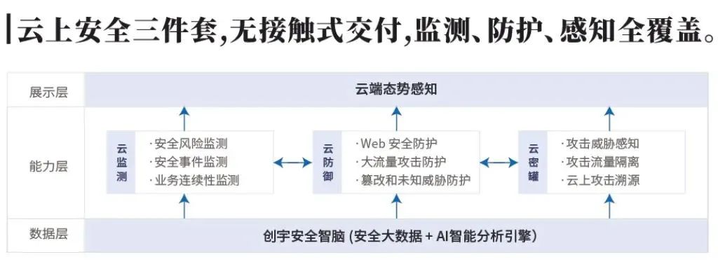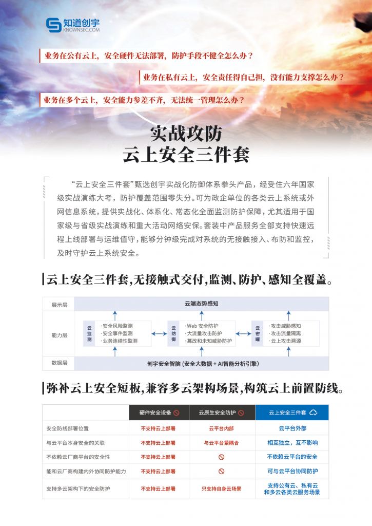 针对系统迁移上云后的安全能力降级、云原生安全能力不足、多云安全能力无法协同防护的难题,知道创宇推出云上安全综合解决方案——“云上安全三件套”,从而弥补云上安全短板,兼容多云架构场景,构筑云上前置防线。