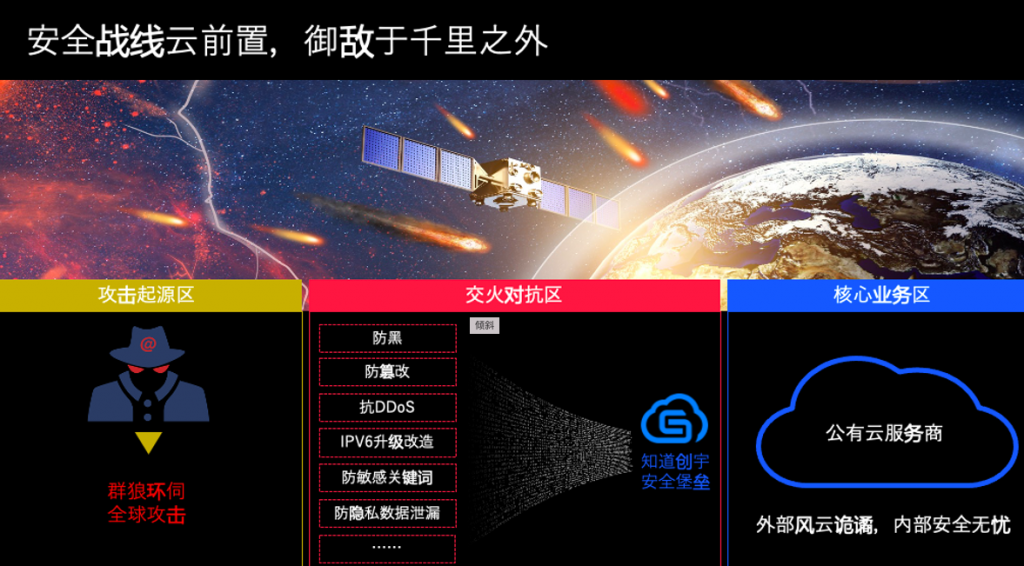 作为国内早期提出云防御理念的网络安全公司,知道创宇提出“安全战线云前置,御敌于千里之外”战略部署模式,把交火对抗区域推进至攻击来源发生地之中。